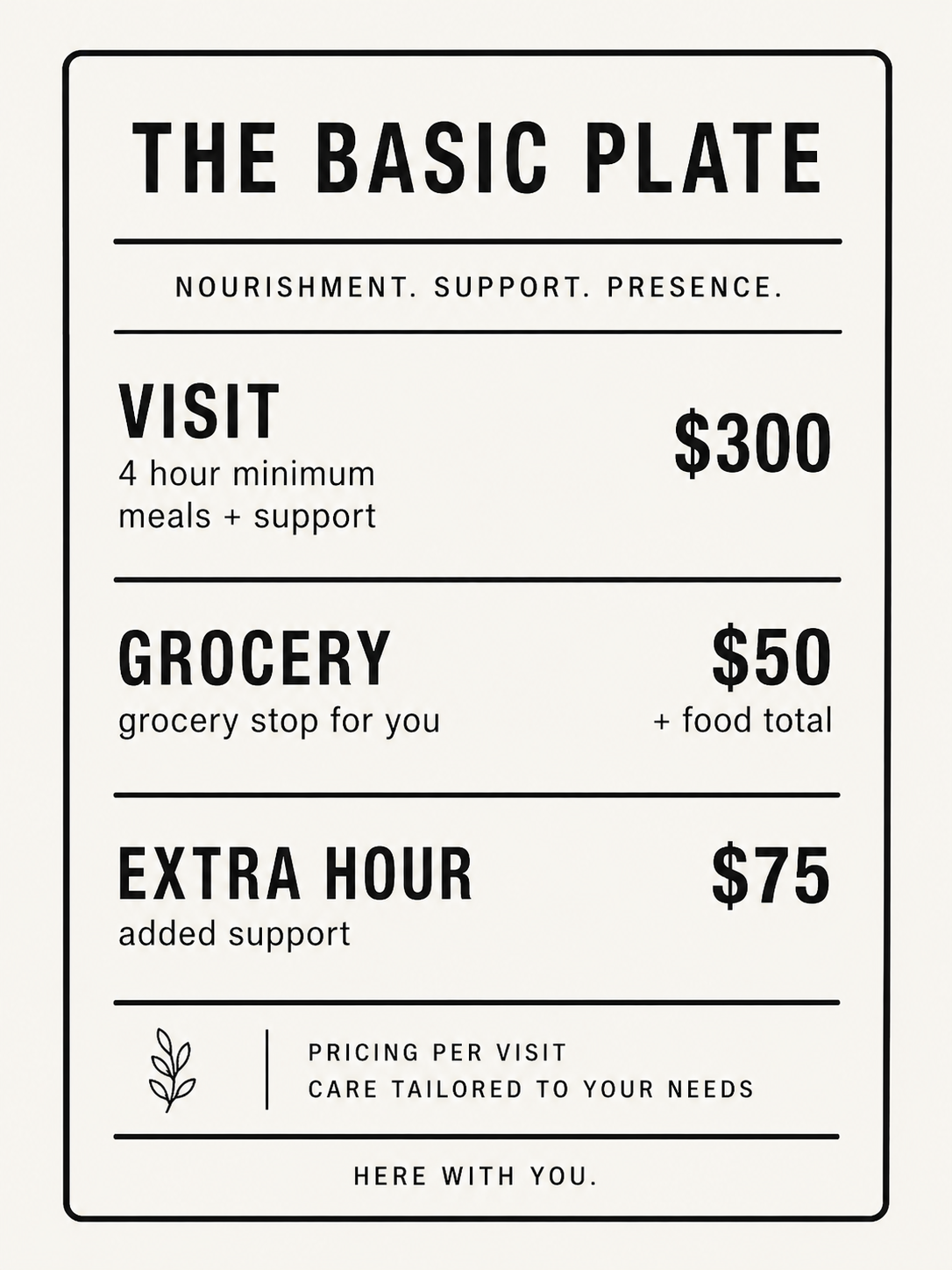 Visits are a minimum of 4 hours. During that time, I prepare 3 nourishing meals, with extra time often used for snacks or breakfast prep.